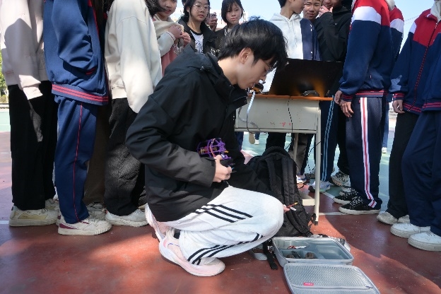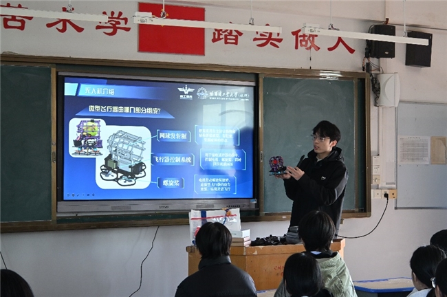 陈嘉圳还现场展示大疆 mini3 无人机与南工骁鹰战队自主设计的微型穿梭机,以这款穿梭机为核心,拆解核心结构,讲解设计所需的机械、电子、编程等专业知识及生产制造环节,清晰呈现无人机从设计到落地的全过程。