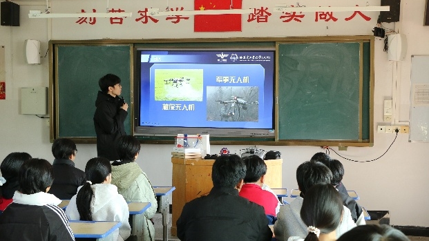 次日上午,无人机科普宣讲与互动体验在校园内展开,实践团在室内用通俗语言讲解飞行器基础知识、应用场景与安全要点,并分享竞赛与训练中的真实经历,把“科技创新”讲清楚、讲具体、讲得可感可学。随后,同学们走向操场观看飞行展示与实操体验,志愿者现场示范启动、转向、维护等基础操作,组织穿越障碍、投放网球等互动任务,在严格的安全指导下邀请同学上手操作。旋翼起落之间,兴趣被点燃、好奇被唤醒;一次次尝试里,同学们感受到科技的魅力,也在“我也能做到”的成就感中收获自信。